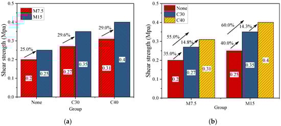 Comparison of the shear strength of specimens (mean value). (a) Comparison under different mortar strength; (b) Comparison under different strength of grouting hole concrete.