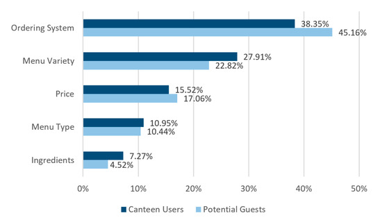 The analysis of the average importances (see Figure 1) clearly reveals that the ordering system (spontaneous choice, preordering) is the most important attribute for both groups (canteen users A: 38.35%; potential guests B: 45.16%). This is followed by the second most desired attribute, menu variety, i.e., the number of dishes offered per day (A: 27.91%; B: 22.82%). The third most important attribute is price (A: 15.52%; B: 17.06%), followed by the menu type (vegan, vegetarian, meat) (A: 10.95%; B: 10.44%) and last, the ingredients (organic, local, seasonal) (A: 7.27%; B: 4.52%). Figure 1 illustrates that, based on average importances, no major differences in the ranking of desired attributes between canteen users and potential guests can be reported (which is also confirmed by logit analyses regarding the individual attribute levels—see Appendix A, Table A3).