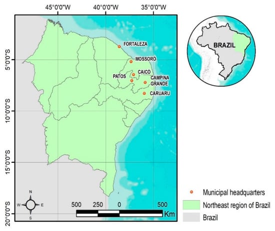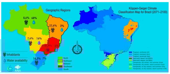 The northeastern Brazilian region (NEB) has been vulnerable to hydrometeorological extremes, especially droughts, for centuries [18,19]. A combination of natural climate variability (most of the area is a semi-arid) and water governance problems increases extreme events’ impacts, especially in urban areas. Intermittent water supply and long water rationing periods due to the low level in reservoirs create a “naturally resilient environment”. People often have to change their consumption behaviour, converting the crisis to an opportunity to increase resilience [20]. Figure 1 shows side by side the geographic administrative regions of the country and Köppen–Geiger climate classification, and it is possible to observe the semi-arid region covering almost the whole NEB territory.