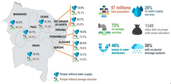 NEB is the Brazilian region that historically faces more problems caused by or related to droughts. The last multiannual drought event in the semi-arid region extended from 2012 to 2018 [23], causing different impacts, such as the drinking water shortage, the decrease in food production, and losses in the economy [24]. In contrast to this semi-arid scenario (Figure 1), in the rainy season, it is typical that floods occur in cities [25,26]. This exposure to both hazards is the reality of many of NEB’s medium-sized cities (with more than 400 thousand inhabitants), where the population deals with water supply shortages [27], as well as floods [28]. Figure 2 shows some numbers that describe the main infrastructure problems in NEB’s cities.