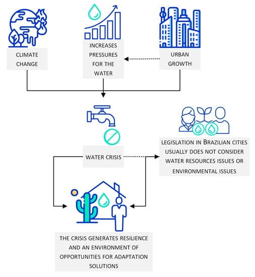 Therefore, the consequences of insufficient water supply lead to a cycle whereby increasing urbanisation increases pressures for the water (water demands), which is aggravated by a poorly urban planned environment. Built-up legislation in NEB cities usually does not consider water resources issues or environmental issues. So, the land-use and occupation planning and permits do not take into account the pressure it imposes on water resources [30]. Other drivers such as climate change and urban growth make a very well-known drought scenario for many “naturally resilient cities” even more difficult. However, this context can make cities more resilient to external shocks and crises for a long time, allowing the development of flexibility to adapt and turn new circumstances into their advantage. That may help turn crises into opportunities for development (Figure 3).