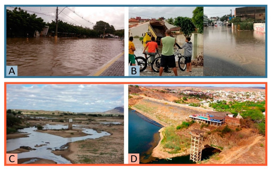 (A) Flood in Caicó (B) and Campina Grande. (C) Water level decreasing in the Caicó primary supply source. (D) Water level decreasing in the Campina Grande primary supply source. Sources: [49,50,51].