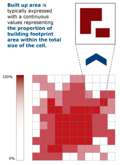 The general methodology behind GHSL (available in https://ghsl.jrc.ec.europa.eu/) data consists of multitemporal products that offer an insight into the human presence in the past—1975, 1990, 2000, and 2014—based on Landsat Images. More recently, in 2016 the European Commission’s Joint Research Center (JRC) reduced some errors in automatic detection of built-up areas with the introduction of S1 data in the GHSL information production workflow [7,8]. This study uses two GHSL products generated from Landsat and Sentinel multisensor global data records. The GHSL built-up grids are clipped for the six cities. The description of the primary data is in Table 3. The GHSL basic concept to make the information from Earth’s surface to a pixel with a built-up area is based on the satellite image classification using machine learning techniques. Human settlement areas characterised by constructed human-made objects (buildings and others) are extracted and referred to as the building footprint area and, finally, modelled into built-up areas (Figure 6).
