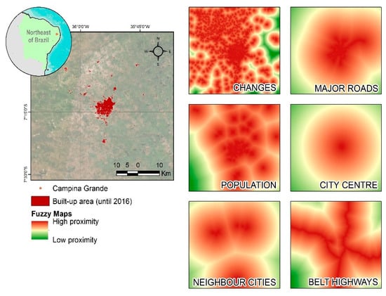 In this study, the built-up area was supplied to the model (SIMLANDER) in the binary form, representing built-up and non-built-up pixels. The main challenge was to explain transition rules (from one date to another) based on some neighbourhood influence. After that, the chosen explanatory (or influencing) variables could be applied in other cities because they often are LULC (Land-Use/Land-Cover) drivers for any changing in urban areas. Table 4 describes the variables and assumptions used in this study. Previous studies have shown the advantages of cost-based distance over Euclidean distance in the estimation of the suitability of occurrence for different land types [52,53,54,55]. Figure 7 shows an example of those variables for one of the studied cities. Each city has different input data and spatial characteristics, and then those maps need to be generated individually in a GIS environment.