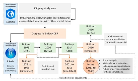 Globally, more than 5.87 million km2 of land has a positive probability of being converted to urban areas by 2030, and 20% of this land (1.2 million km2) has a high probability (>75%) of urban expansion [1]. Intensive urban sprawl has been a significant challenge for regional and global sustainability [1,2]. This growth trend in urban areas causes pressure on natural and energy resources. It might result in an overload of existing urban equipment and services if they are not adequately planned to absorb the increased demands in terms of water consumption, collection and treatment of wastewater, appropriate disposal of garbage, and road support [3]. Urban growth also crucially affects flood risk [4]. Predictive models and methods that simulate these sprawl phenomena can support decision makers towards a better and more sustainable urban design. In particular, urban land-use change models are extensively applied by researchers and planners to control urban sprawl and the protection of natural space [5]. In cities, land-use changes can be speedy. Field data are essential for a good quality presentation of scenarios, to better explain land-use transitions from past to present, and to simulate future scenarios. One type of field data for urban growth trend analysis is built-up maps. The coupling of recent remote sensing technologies and spatial modelling offers the opportunity to deliver worldwide geo-datasets depicting built-up surfaces and population distribution that can be consistently used for global risk modelling, impact analysis, and policymaking in the field of disaster risk reduction [6]. In this sense, the Global Human Settlement Layer (GHSL) datasets [7] represent an unprecedented source of information for understanding global changes and trends in exposure to natural disasters. The GHSL produces continuous global-scale mapping of human settlements, servicing internationally agreed upon calls for a massive volume of multisource, multitemporal, and multiscale earth observation data [7,8]. Moreover, it operates in a fully open and free data and methods access policy. Their built-up grids represent the first multitemporal explicit description of the evolution of built-up presence since 1975 [8].