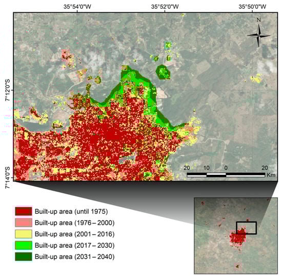 The same phenomenon occurred in the other cities studied and it shows how urban dynamics are observed spatially. Thus, the results indicate the new percentage of urbanised areas and where the phenomenon (new urban built-up) will probably occur. Built-up surfaces can be used consistently for global risk modelling, impact analysis, and policy formulation in disaster risk reduction [6]. For instance, the northeast portion of Campina Grande’s city has been going through an accelerated urbanisation process, driven by the construction of private residential condominiums and proximity to the neighbour city of Lagoa Seca (approximately 4 km far from Campina Grande). In this case, the variable “distance to other cities”, generally disregarded in other CA urban models, explains a type of urban growth frequent in NEB cities: a strong economic and social dependence between cities, triggering it as an attractor of changes. It is worth highlighting how precise and accurate an expansion water supply plan could be based on those simulations. In NEB cities, the new allotments usually are sold out before the suitable infrastructure. There is a massive disconnection between urban planning and water supply planning in this city [30]. In this sense, a simulation of where the built-up spreading will possibly happen should support land-use guidelines and permits towards a more sustainable and resilient city. Regarding the six cities, Figure 10 shows the 2016 GHSL data (used for accuracy validation) overlaying the 2040 future scenario (the last year of the simulation).