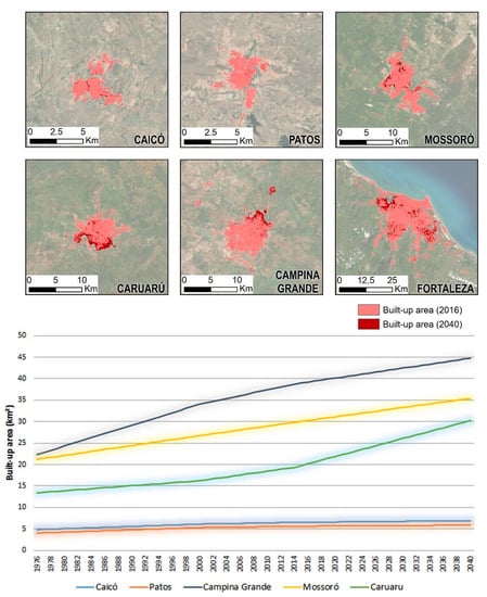 Campina Grande, Caruaru, and Mossoró are known because of their strategic location in their states. They are middle-sized cities crossed by major roads, making them “passing through” cities for many NEB trade routes. Besides, those cities have a strong relationship with cultural tourism, which attracts tourists from many other parts of the country in some months of the year. The built-up process in those cities is very similar, as are their climate conditions and urban water problems. Fortaleza was excluded from this graph analysis because it is the biggest city (with more than 250 km2 of built-up area, making it impossible to visualise it in the same graphic scale of the other cities), and it presents itself with behaviour typical for a capital and coastal city in NEB—with urban growth and spreading along the seaside.
