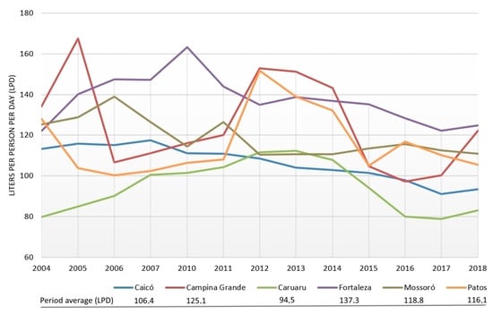 Caruaru had the lowest LPD average for the analysed period. In 2017, for example, the population living in that city was submitted to a severe water rationing with only five days with water supply service in every 25 (twenty-five) days. At the end of the drought period, the population started being supplied by water 10 (ten) days per month (five days every 15 days) [59], which reduced water consumption considerably.