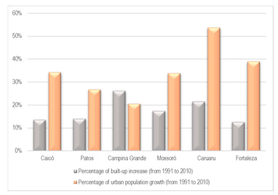 When the population increase is more prominent than the built-up increase, it can mean a high-density occupation trend. It can mean the densification of buildings in some urban areas and a more punctual pressure for water resources in some areas of the city than others. This was the case in Caicó, Patos, Mossoró, Caruaru, and Fortaleza. Campina Grande differs from other cities and has a higher percentage of the built-up area; this behaviour reflects housing estates’ construction in peripheral neighbourhoods (urban fringes) and new residential condominiums, accentuating land-use changes and spreading.