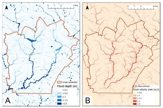 CADDIES simulations for Campina Grande (PB): (A) flood depth peak, (B) flood velocity peak.