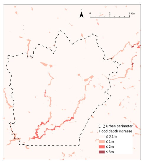 Having the flood depth increase for any future scenario in a raster with values per pixel allows flexibility of urban water management and planning once it is possible to aggregate and visualise the information by census block or urban basins (Figure 15A,B). Figure 15 is an example of a significant result derived from the built-up simulation when it is used for floods studies. Administrative boundaries as a census track or hydrological unities as the urban basin can be chosen as planning unities for zonal guidelines.