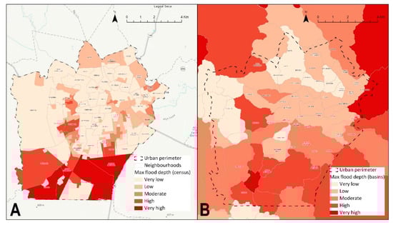Flood increase in Campina Grande, PB in a zonal analysis: (A) census blocks, (B) basin.