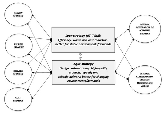 The classic concept of SCS divides it into two basic categories (Figure 1): lean and agile [6]. Whereas a lean SCS efficiently accelerates all the supply processes in the chain, an agile SCS focuses on the restructuring of the supply chain in response to uncertain and dynamic circumstances. Recent works continue to emphasize the need to determine which competitiveness ingredients the agile and lean strategies must have in order to favor collaboration with members and gain better integration of activities within the company itself [5].