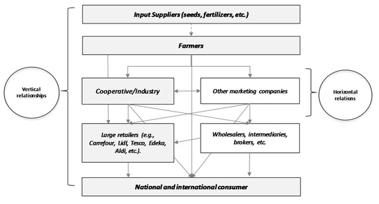 Over time, grower organization systems have diversified in terms of role, size, and even terms of association, varying by the country of origin and the product commercialized. Even within one SC itself, large companies with exporting power can coexist with other small ones dedicated to local sales. At the same time, commercial chains can be either long or short. In the first case, intermediate agents are involved until the product reaches the consumer. This group includes members of the agrifood industry, wholesale companies, buying centers, and retailers. In the second case, although the short chain is simpler, it can still include the retailer, therein lying the strategy of important distribution brands for seeking out local suppliers that can offer direct provision (Figure 2). Indeed, this sector features a complex supply network that includes horizontal relationships, which are more common in the production link and involve cooperation with other companies to improve market access and promote coordinated innovation activities. There are also vertical relationships designed to optimize joint processes (e.g., transport, provision, and marketing).