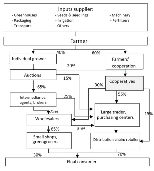 In recent years, the south of Spain (mainly the provinces of Almería, Granada, and Murcia) has become the principal horticultural supplier in Europe; 40% of the vegetables consumed in Europe come from Spain. Hence, Spain is considered as the leading European exporter of vegetables (5300 million euros, 70% of all production), mainly supplying Europe itself. The consumer purchases its products, at least 65%, in commercial establishments from huge distribution chains (e.g., Aldi, Lidl, Carrefour, Edeka, Tesco). Figure 4 reflects the supply chain under analysis, which can be said to consist of several layers (producers–marketers), intermediaries, and large-scale distribution (retailers). As can be observed in the figure, the relationship between the two main marketing companies (cooperatives and auctions) and retailers, either individually or through purchasing centers, dominates the sales to the final consumer.