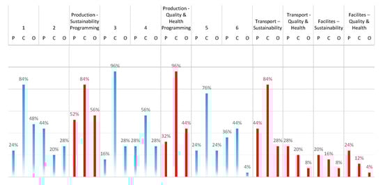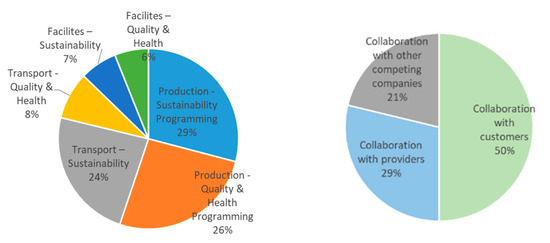 As can be observed in Figure 5, horticultural commercialization companies have primarily been concerned with aspects related to sustainability and quality. The environmental aspects, related to production scheduling, are also an area that is drawing attention, above all, due to the growing trend to sign agreements with clients to maintain a continuous supply. In contrast, social aspects show less development. This may be because social aspects are considered to be responsibilities that are dependent on public administrations. On the other hand, most companies collaborate with clients, albeit in many cases, they do so to comply with quality standards, for example, to be able to sell. Horizontal collaboration is based on business agreements for the sale of common products of high quality. These agreements also demand collaboration with seed suppliers for the exclusive sale of specific varieties of a product. More specifically, agreements with other companies in the sector and suppliers are based on initiating projects for the reduction and optimization of production inputs. As for the aspects related to transport, sustainability is applied, in collaboration with the client, for the optimization of cargo. However, collaborating with other companies in the sector is preferred in order to test other forms of transport. Quality in transport is developed, in collaboration with the supplier, by implementing control systems to avoid generating waste, for example, due to any breaks in the cold chain. Collaboration in the area of Transport—Quality and Health with other companies in the sector, is a practice aimed at opening new markets and developing new logistics systems that guarantee product quality in the long term. Coordination in the area of Facilities—Sustainability mainly occurs with suppliers seeking to optimize greenhouses, for example, attempting to incorporate new, more sustainable energy generation systems. With regard to quality, investment in facilities is conducted with customers interested in agile management of merchandise at the destination to improve product quality and consumer service. In general terms, the most common dimensions are those related to the management of sustainability and quality in production, most of which are carried out in collaboration with customers (Figure 6). It is worth noting that sustainability surpasses quality control, a detail that contradicts recent studies in the sector [57]. Undoubtedly, in recent years, horticultural companies have devoted more attention to these areas. Table 1 displays a summary of the specific strategies, the most important, according to management dimensions in the supply chain.