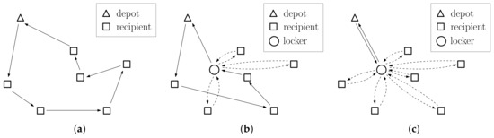 Schematic representation of possible scenarios for one courier express parcel (CEP) service provider. (a) Status quo where all recipients are directly served by the CEP service provider. The CEP service provider tries to find an optimal tour of minimal length visiting all recipients. (b) Some of the recipient employ the locker such that the CEP service provider does not need to visit all recipients. However, the locker location needs to be called at by the CEP service provider. (c) Extreme case where all recipients employ the parcel locker. The resulting logistics network corresponds to a classical hub-and-spoke network.
