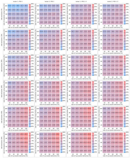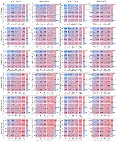 Each cell in the diagrams represents the mean value of 30 runs for the specific scenario. For example, the mean percentage change in traveled distance when employing parcel lockers for a setting where no extra trip is performed to collect a parcel (rate exclusive 0%), almost half of the parcels can be successfully delivered at home (successful deliveries 40%) and only a few commuter (using lockers 20%) use the parcel lockers located at the train station (locker 1). The values are computed as the differences of the distances traveled without employing parcel lockers and the distances traveled with using parcel lockers. To avoid biases, not only the distances traveled for retrieving the parcels are considered but also the distances covered for reaching the POIs. Consequently, a positive value indicates a negative impact (additionally traveled distance).