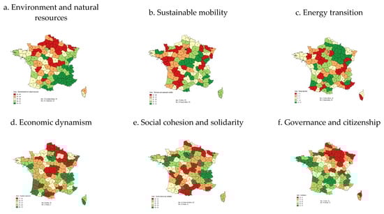 This paper provided an evaluation framework for comparing sustainable territorial development in French NUTS3 regions (departments). The departments’ performance in terms of sustainable development was analyzed though different approaches. First, we proposed a set of six composite indices considering six dimensions associated to sustainable development (i.e., environment and natural resources, energy transition, sustainable mobility, economic dynamism, social cohesion and solidarity, and governance and citizenship). Second, we analyzed whether there is any spatial autocorrelation explaining the performance of the indices. Third, by applying a hierarchical ascendant classification (HAC), we can classify French departments into five classes.