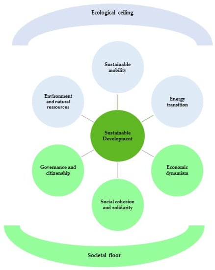 Inspired by the work of Raworth [14], we selected three dimensions concerning the ecological ceiling—these are environment and natural resources, energy transition, and sustainable mobility—and three dimensions associated to what we call the societal floor—economic dynamism, social cohesion and solidarity, and governance and citizenship (Scheme 1). We thus expanded the social floor proposed by Raworth [14] to a societal floor, which encompasses not only an equity dimension but also an economic dimension and a political dimension.