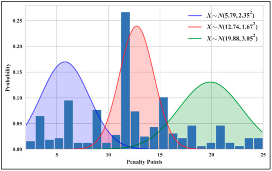 A GMM has been shown as an effective way for modeling data similar to this paper [51]. Theoretically, GMM is capable of characterizing data with any Gaussian distribution when the number of Gaussian components is large enough. For comparison with subjective data, the authors choose the three most important principle components. On this basis, GMM fits the distribution of the whole data by summarizing the distribution of three separate components. After applying GMM, the objective data, namely penalty points, were clustered into three clusters. As shown in Figure 1, 2–8 penalty points were regarded as the first level (M = 5.79, SD = 2.35), 9–16 were the second level (M = 12.74, SD = 1.67), and 17–25 were the third level (M = 19.88, SD = 3.05). Higher levels of penalty points indicate greater aggressive driving behavior.