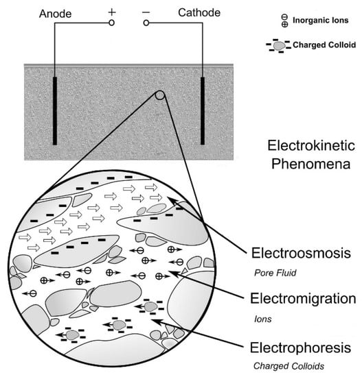 Unlike other recent reviews on electrochemical applications [,,,], the purpose of this contribution is to present an overview on applications and technical solutions related to the electrokinetic remediation of soils, shifting the focus more on their sustainability compared to previous revisions []. The fundamentals of the technology will be briefly mentioned first, together with the phenomena that occur in the soil, which are the basis of its effectiveness.