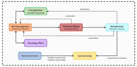 Moreover, since soils are usually characterized by a high ionic resistance, an increase in temperature is normally observed (Joule–Thompson effect) []; the dissipated energy is proportional to the square of the current flowing through the soil. It is worth noting that, in the presence of volatile pollutants, this can cause significant environmental problems.