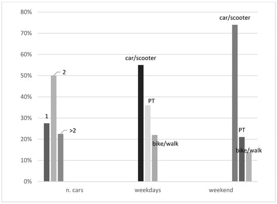 All respondents had a driving license. On average, the number of cars available for each member of the respondents’ household having a driving license was 0.5. The car was the transport mode most frequently used by 49% of the sample during weekdays and by 70% of the sample during weekends. The second most frequently used transport mode was the bus, used by 36% of respondents on weekdays, but only by 21% of the sample during weekends (