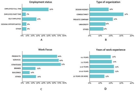 Of those respondents who reported their country of work (n = 97), 78% worked in Europe and the other 22% in the rest of the world (25 countries were represented in this sample). The most prominently represented European countries were the Netherlands (38%), United Kingdom (12%) and Germany (9%). Countries most prominently represented in the rest of the world were the United States of America (29%), Australia (19%) and India (14%). Furthermore, most respondents were employed (84%), had a design background (63%), worked in a large organization (45%), and focused on developing products, services, and strategies. There was an even spread in work experience. Full details are shown in Figure 1A–D.