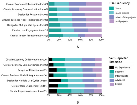 To assess the extent to which the competencies were recognized by an international group of designers, we analyzed the responses for Use Frequency and Self-Reported Expertise. The responses for Use Frequency for each of the seven competencies is shown in Figure 2A. With the exception of Circular Impact Assessment, more than 50% of the respondents indicated that they used each competency in half or all of their circular economy projects. The Self-Reported Expertise of the respondents per competency is shown in Figure 2B. There was a significant correlation between Use Frequency and Self-Reported Expertise for each of the competencies. The correlation coefficients were positive and ranged between 0.65 and 0.83. This implies that a higher Use Frequency goes hand in hand with a higher Self-Reported Expertise of the competency.
