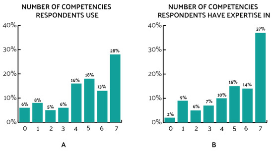 Distribution of the number of competencies respondents used (A) and distribution of the number of competencies respondents had expertise in (B). 0 = none of the competencies used or no expertise. 7= all seven competencies used or expertise in all seven competencies.
