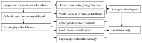 In the late 1970s, China began to implement the Household Contract Responsibility System (HCRS) for agriculture. Addressing the reality of more people than land and based on the principle of fairness, village committees implemented the strategy of allocating accessible fertile and barren farmland equitably among farming households. This led to the emergence of small and fragmented farmlands managed by individual households, a situation that continues to this day. Consequently, it has become difficult to apply advanced technology to such small-scale and fragmented contracted farmlands in order to increase agricultural productivity. Additionally, the total agricultural income from such small farms may be insufficient to support family life, with little scope to supplement this income. As a result, younger rural laborers are compelled to leave farming due to the fragmented farmland, lower income, and high barriers to accessing farmland. Industries with higher salaries are attracting more young people, with various consequences. Firstly, the rural farming labor force is rapidly declining, which is harming agricultural productivity [3]. Secondly, the remaining rural farming labor force is aging quickly [3]. Thirdly, the inefficient use of fragmented agricultural land is apparent [4], and the number of farms engaged in grain production in China has declined over recent years [5]. The overall food supply system in China is insecure and over-burdened. The mechanism underlying this food insecurity is illustrated in Figure 1.