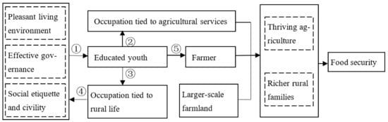 China’s RRS will ultimately ensure food security—the key is to attract and retain educated youth labor based on their pursuit of maximum utility. Due to delays in young graduates taking over farms, it is challenging to precisely determine whether they will eventually work as farmers in the future. Therefore, we must clarify the logic underlying the aims of the RRS before we can understand how to attract youths to work as professional farmers. This logic is described in Figure 2. In order to attract and retain educated youths in rural areas (labeled by pathway ①), they should be provided with certain preconditions, including pleasant living environments, effective governance, and social etiquette and civility, which are three aims of China’s RRS. Educated youths also have to be attracted and retained to effectively execute these great preconditions (labeled by pathway ④). The occupations in rural areas can be divided into three types: those tied to rural life, to agricultural services, and farming. Thus, operating thriving businesses requires combining agricultural services, rural life, and farming occupations, which also require the entry of educated youths (labeled by pathway ②, ③ and ⑤) to guarantee smooth farming processes. Employing educated youths in larger-scale farmlands improves productivity and yields higher income, thereby ensuring food security. The three systems, which can be achieved by pathway ②, ③ and ⑤, are equally important, attracting educated youths, service agriculture and farming directly.