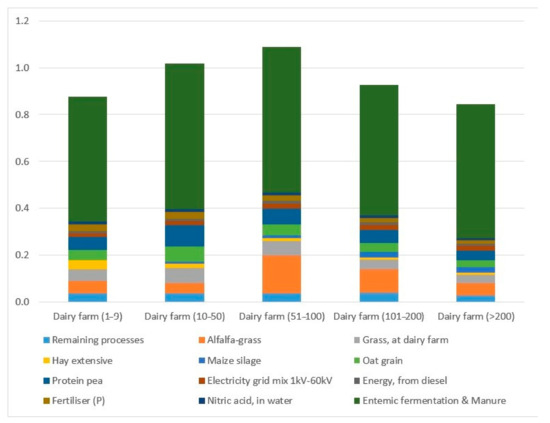 In our study, for all the farms enteric fermentation had the largest impact on the GWP, followed by feeds (alfalfa, protein feeds, and grass) and electricity consumption. Increasing the consumption of concentrated feeds in the largest herds lead to higher milk yields and thus, helped to decrease relevant environmental impacts. The global warming potential of the raw milk at the farm gate in different LCA studies varies significantly—from 0.9 to 2.4 kg CO2e per kg of milk [27,32]. Results from our study are on the bottom line of this spectrum. This could be explained with the scope of the study excluding heifer rearing, which could increase the global warming potential of the milk by roughly 1/5 [33].