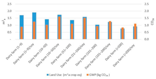 Additionally, we looked at changes in the environmental impacts of supplementary protein substitution. In this case, we analyzed substituting pea in the combined feed with soy, as it is increasingly entering the market as a high-protein feed for dairy cows in Latvia. For this, we used global process data on the environmental impacts of soy meal production from the Ecoinvent database [21]. Results demonstrated that most of the environmental impacts would increase, e.g., GWP for the farms with 10–50 cows would increase by 57% and for the largest farms by 32% (see Figure 2), but on average GWP per kg of milk would increase by 43%. As a result of the substitution, the land use in the smallest farms would increase by 12% and for other farms by 19%, on average increasing the land use of raw milk production by 18%. These increasing impacts are mostly linked to the soy production-related land-use change, domestic transport, and industrial processing [28]. However, it can also be assumed that introducing soybean meal to the diets of the dairy cows would decrease the protein supplement fed to keep the diets isonitrogenous.