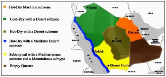 Building design in Saudi Arabia is strongly related to its local climate conditions and geography. Saudi Arabia is located in western Asia, with different climate regions ranging from the Mediterranean to the subtropical desert climate. Figure 1 shows the different climate zones in Saudi Arabia [12].