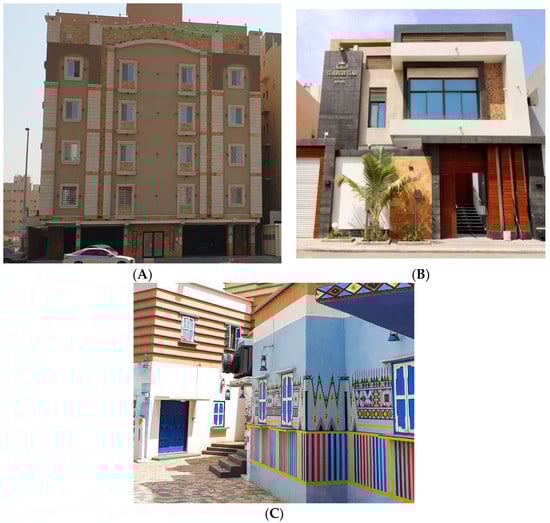 Categories of residential buildings in Saudi Arabia, where (A) shows a residential building block (flats), (B) shows a villa, and (C) shows a traditional house built with high-thermal performance materials [15].