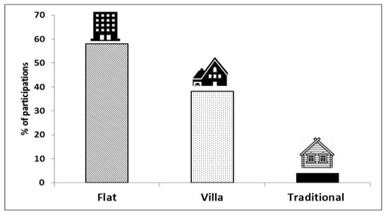 Based on the survey conducted in our recent study on a total of nearly 1500 people [15], more than 55% of Saudi citizens live in building blocks (Figure 3). In addition to this, about 40% say that they live in a separate modern house or villa, while less than 5% live in traditional houses. These traditional houses are considered to be old buildings, were usually built before 1950, and were constructed using traditional locally developed building materials such as clay and stone. This type of local traditional building material has a beneficial characteristic of thermal mass, which aids a building in adapting to the hot climate in Saudi Arabia with the absence of an air conditioning system. There are some recent studies that focus on the durability and resistance of old and historic buildings in Saudi Arabia compared with more modern buildings [15].