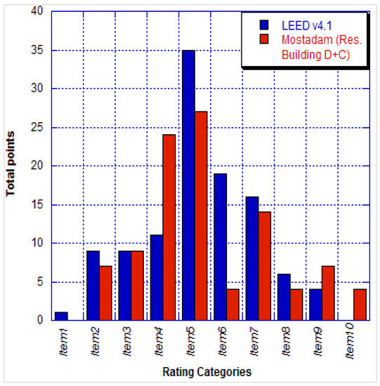 Total point comparison for the categories of LEED v4.1 and the Mostadam rating system Element #1.1 (res. buildings D + C).