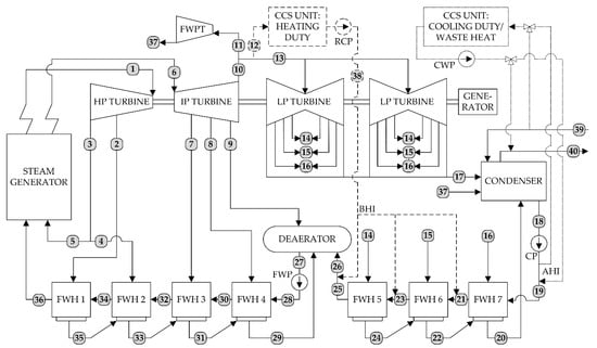 In the present study, a coal-fired power plant with net electricity capacity of 700 MW is selected as the reference power plant without CCS. The analyzed steam cycle configuration comprises a single-stage reheat and eight feedwater heaters (FWH), as shown in Figure 1. Steam cycle configurations with double reheat and nine or more feedwater heaters are also possible. The double reheat steam cycle would increase the thermal efficiency by an additional 1% but at added capital and maintenance costs [33,34]. Four feedwater heaters (FWH 1–4) are placed at the high-pressure side while three feedwater heaters (FWH 5–7) and the deaerator are placed at the low-pressure side. The electricity generation unit includes a high-pressure (HP) turbine, an intermediate pressure (IP), two double-flow low pressure (LP) turbines and the electric generator. Superheated steam enters the HP turbine at state ① and expands to state ③. The cold reheat ⑤ is brought into the boiler reheat section and enters the IP turbine at state ⑥. In the IP turbine, steam expands to state ⑩ and is brought to the LP turbines where it expands to state ⑰. The steam quality in the exhaust state ⑰ is around 0.9 and depends on the reheat pressure in ⑥. The cycle thermal efficiency could be increased by raising the reheat pressure at the expense of lower steam qualities and accelerated erosion in the last stages of the LP turbines. In the present analysis, the reheat pressure is limited at one-fifth of the main steam pressure in order to avoid exhaust steam qualities below 0.88. In the condenser, the exhaust steam is turned into liquid water ⑱. The condensate pump (CP) sends water to the low pressure FWHs ⑲. In the three LP FWHs, the condensate water is subsequently heated to states ㉑, ㉓, and ㉕. The deaerator removes dissolved gases from the feedwater and feeds the feedwater pump (FWP). The FWP provides the necessary water head ㉘ while overcoming the pressure drops in the high-pressure FWHs and in the boiler. The FWP is driven by the feedwater pump turbine (FWPT) running on steam extraction ⑪. The exhaust steam from the FWPT ㉞ is sent to the condenser. The condenser pressure is 0.04 bar, corresponding to coolant inlet and outlet temperatures of 17 °C ㊴ and 25 °C ㊵. After the FWP, feedwater is preheated to states ㉚, ㉜, ㉞, and ㊱ as it passes the four HP FWHs. The FWHs are shell-and-tubes heat exchangers where feedwater is heated by extracted steam ②, ④, ⑦, ⑧, ⑨, ⑭, ⑮, and ⑯. The deaerator is a direct-contact heat exchanger where feedwater ㉖ is heated by the extracted steam ⑨ and the subcooled condensate ㉙.
