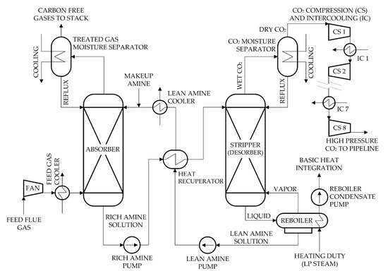 The dominant factor affecting the electricity penalty is the reboiler heating duty for absorbent regeneration. Amine absorbents such as monoethanolamine (MEA) and methyldiethanolamine (MDEA) are considered mature technologies, commercially available for scrubbing of dilute CO2 from flue gases. MEA has high CO2 absorption rates but at the expense of large heating duties (3.1–4.2 MJth/kgCO2), caused by high enthalpies of reaction with CO2. MDEA solutions offer lower heating demands but at the drawback of reduced CO2 absorption rates. Amine solutions blended with CO2 absorption promoters [45] and non-amine absorbents are being studied to alleviate the electricity penalty in CCS integrated power plants. Aqueous ammonia (NH3), aqueous piperazine (PZ), potassium carbonate (K2CO3), and mixed-salt technology (MST) are potential alternatives with heat requirements as low as 2.0 MJth/kgCO2 [46] that could be deployed for large-scale CCS in the future.
