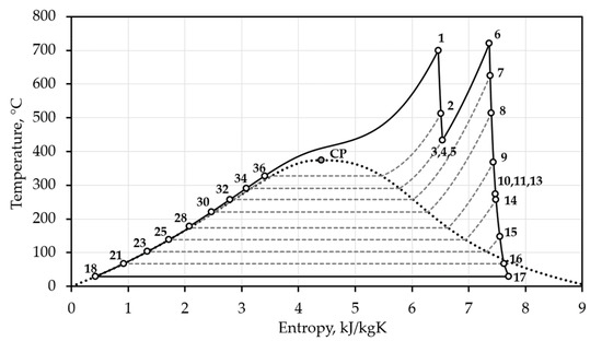 Temperature-entropy chart of the reference advanced ultra-supercritical (A-USC) steam cycle with. superheat/reheat temperatures of 700/720 °C and pressures of 350/75 bar.