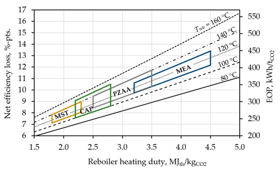 Figure 5 shows the net efficiency loss and the electricity output penalty (EOP) in the A-USC steam cycle with respect to the specific heating duty, the reboiler temperature, and for different absorbent solutions. The reboiler heating duty determines the steam quantity while the reboiler temperature defines the steam quality to be extracted from the IP/LP crossover pipe [38]. The reboiler temperature dictates the steam condensation pressure in the reboiler and the pressure of the steam extraction from the IP/LP crossover. Generally, it can be seen that the net efficiency penalty increases with the reboiler heating duty and the reboiler temperature, which, on the other hand, depend on the absorbent type and process optimizations.