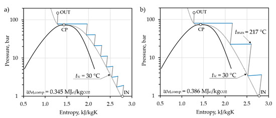 The baseline CO2 compression, shown in Figure 6a, returns a specific auxiliary consumption of 0.345 MJel/kgCO2, whereas the theoretical minimum (isothermal compression) is 0.296 MJel/kgCO2. By selecting fewer intermediate cooling stages, the compression duty increases since the compression process departs from an optimum isothermal compression. For example, the same eight-stage compression process with three intercooling stages would need 0.386 MJel/kgCO2, an increase of 12% with respect to the baseline case, as shown in Figure 6b.