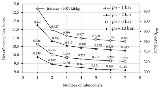 Net efficiency loss, electricity output penalty (EOP) and compression power duty as function of the number of intercooling stages and CO2 inlet pressure.