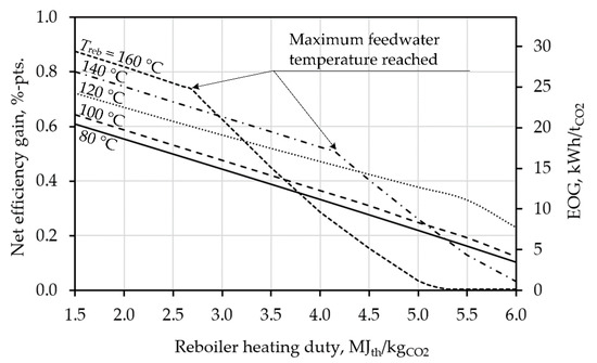 The net efficiency gain and the electricity output gain (EOG) in the analyzed CCS A-USC steam cycle is shown in Figure 8 against the reboiler heating duty and the reboiler temperature. It can be seen that AHI offers higher efficiency gains at low reboiler heating duties and high reboiler temperatures. For a given reboiler temperature, the net efficiency gain increases by reducing the reboiler heating duty. In addition, for a given reboiler heating duty, the net efficiency gain increases with the reboiler temperature, but with some exceptions. When the waste heat temperature and the waste heat quantity are such that the feedwater tank inlet temperature is reached, additional waste heat cannot be allocated into the LP feedwater preheating line. This means that the entire LP feedwater preheating range is supplied by waste heat, the LP FWHs are bypassed, and the LP steam extractions are closed. From this point onwards, the AHI efficiency gain drops abruptly since steam is extracted from the IP/LP crossover, but waste heat is not returned into the LP preheating line. As shown in Figure 8, the maximum LP feedwater temperature is achieved for: (1) Reboiler temperature of 140 °C and specific heating duty of 4.14 MJth/kgCO2 and (2) for reboiler temperature of 160 °C and specific heating duty of 2.69 MJth/kgCO2. AHI applied on the A-USC steam cycle configuration bring an efficiency gain of 0.53%-pts for CO2 absorption with 30 wt% MEA solution (3.50 MJth/kgCO2, 120 °C). In that case, the corresponding electricity output gain is 17.8 kWh/tCO2.