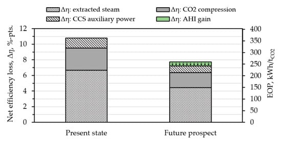 The levels for future prospect are obtained assuming an average 30% reduction in CCS energy requirements relative to present day technology. The reduced heating and cooling energy duties of 2.5 MJth/kgCO2 and 3.4 MJth/kgCO2 could be achieved with enhanced CO2 absorbents, CCS process optimization, and advanced heat integration (AHI). The reduced power duties of 0.25 MJel/kgCO2 for compression and 0.11 MJel/kgCO2 for auxiliaries could be achieved with higher CO2 inlet pressures (3 bar) and highly efficient compressors. The net efficiency loss of future CCS is estimated at 7.20%-pts, an improvement of 3.6%-pts over present day available technology. The EOP would be reduced to 241.7 kWhel//tCO2, down by one-third relatively to the present EOP.