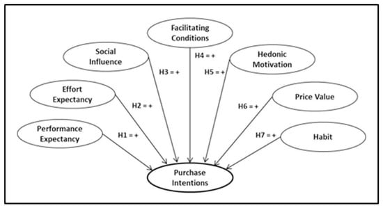 The present research is based on the UTAUT2 model [18]. The UTAUT models [17] and their predecessors—the Technology Acceptance Models (TAM) [19,20]—have been widely used to explain behavioural intentions regarding technological products, such as the use of smartphones [37]. They have also been used, albeit to a lesser extent, to explain behavioural intentions in the context of technological services, such as tourists’ use of online travel reviews [38] or green technology use behaviour in the hospitality industry [39]. In the present study, the UTAUT2 model is used to analyse potential tourists’ purchase intentions regarding a thermal suite (non-technological service). The following sections address the theoretical background for the variables included in the proposed model.