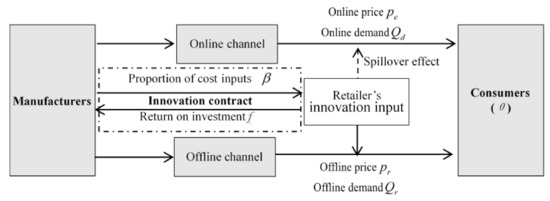 We consider a supply chain system composed of a leader, i.e., the manufacturer, a follower, i.e., the retailer, and a consumer, as shown in Figure 1. On the one hand, the manufacturer provides products to the retailer at wholesale price , and the retailer sells the products to consumers at offline price through physical channels. On the other hand, the manufacturer actively opens online channels to directly sell its product at price . Without a loss of generality, we suppose [42]. To respond to the impact of the online channel on the offline channel, the retailer invests in innovative inputs, which can increase the demand of the retailer channel market. Meanwhile, this has a positive spillover effect on the market demand of the online channel, which means that consumers can receive the services offered by the physical retail channel while purchasing products through the online channel. In other words, the innovation inputs provided by physical retailers can not only increase their own demand but also increase the demand for online channels. At the same time, to encourage the retailer to provide innovation inputs, alleviate channel conflict and improve the efficiency of channel operation, the manufacturer and retailer must cooperate, and each has a coordinated contract. The contract’s action mechanisms are as follows: the manufacturer invests in the retailer’s innovation inputs and shares the retailer’s innovation input cost in proportion . At the same time, the retailer compensates the manufacturer with fixed proportion f to increase the manufacturer’s investment enthusiasm.