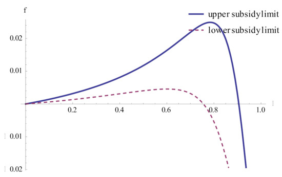 Figure 3 shows an optimal interval between the fixed compensation received by the manufacturer, i.e., there is upper subsidy limit > 0 and lower subsidy limit > 0. In the optimal compensation interval, both the retailers’ and manufacturers’ profits are greater than those under the uncoordinated strategy, which means that the dual-channel coordination model with fixed compensation is effective in coordinating channel conflicts. Figure 3 shows that the upper limit of fixed compensation tends to increase first and then decrease as the proportion of sharing increases. As the proportion of the cost of innovation shared by the manufacturer increases, the retailer can effectively incentivize the manufacturer to share the cost of innovation by providing more subsidies. However, when the fixed subsidy exceeds the benefits of innovation, the retailer’s profits and enthusiasm for cooperation are reduced, causing the fixed compensation to decrease.